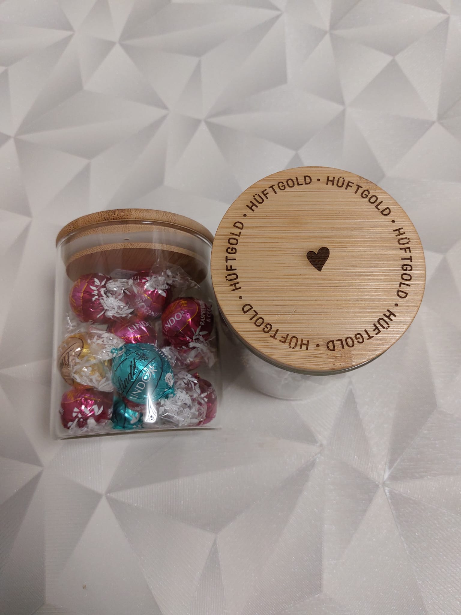 Der Bambusdeckel trägt die Gravur „Hüftgold“ und verwandelt das stilvolle Glas in einen witzigen Hingucker für Küche, Schreibtisch oder Naschschublade.