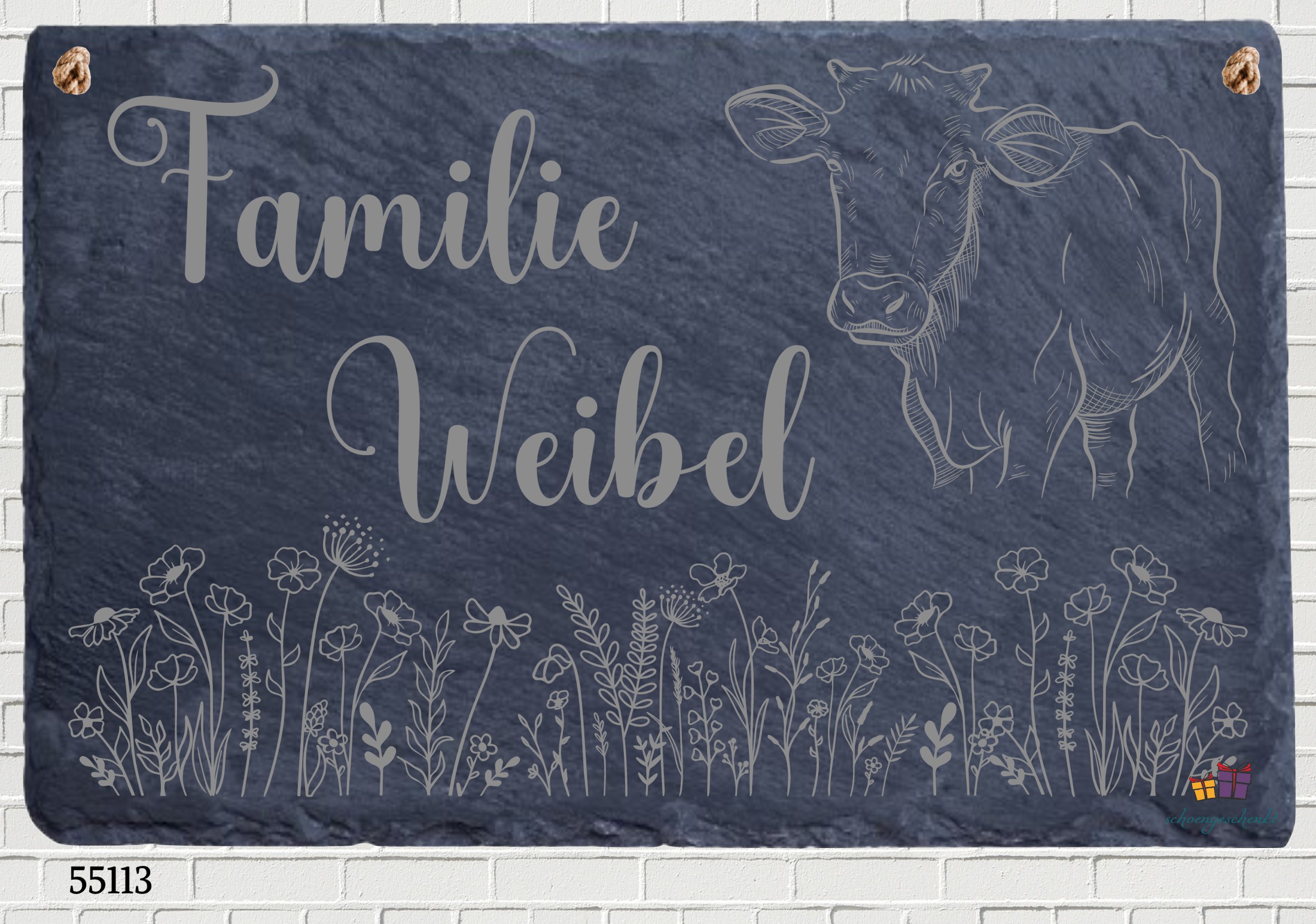 Ein Stück Heimat für die Wand. Diese liebevoll gestaltete Schieferplatte vereint familiäre Wärme mit ländlichem Charme. Der elegante Schriftzug „Name der Familie“ wird von einer feinen Kuhzeichnung und zarten Wildblumen begleitet – ein Symbol für Naturverbundenheit, Zusammenhalt und das Leben auf dem Land. Ob am Hauseingang, im Garten oder als Geschenk für echte Landmenschen: Diese Platte ist mehr als Dekoration – sie ist ein Statement für familiäre Wurzeln und natürliche Schönheit.