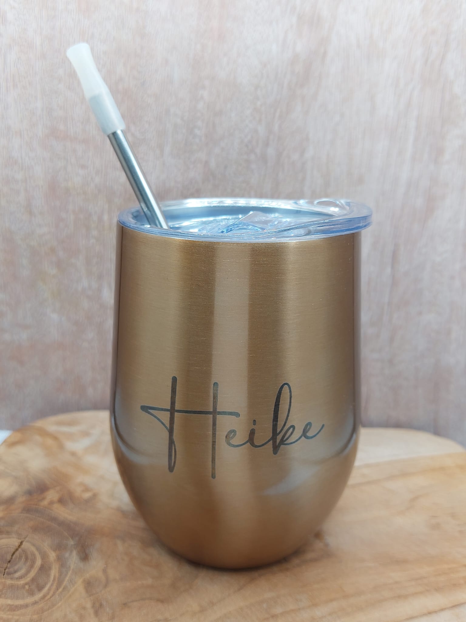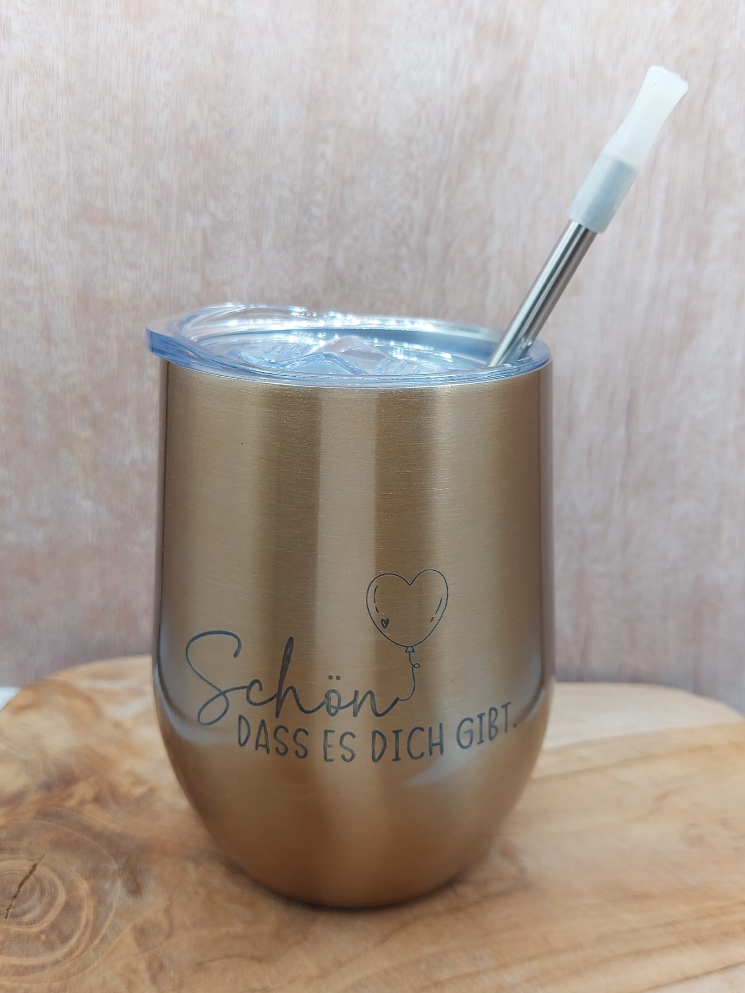 Genuss für unterwegs! Der stilvolle Wein-To-Go-Becher ist nicht nur praktisch, sondern auch ein echter Hingucker. Mit der fröhlichen Gravur „Schön, dass es Dich gibt!“ auf der Vorderseite und einer individuellen Namensgravur auf der Rückseite wird er zu deinem ganz persönlichen Lieblingsstück.