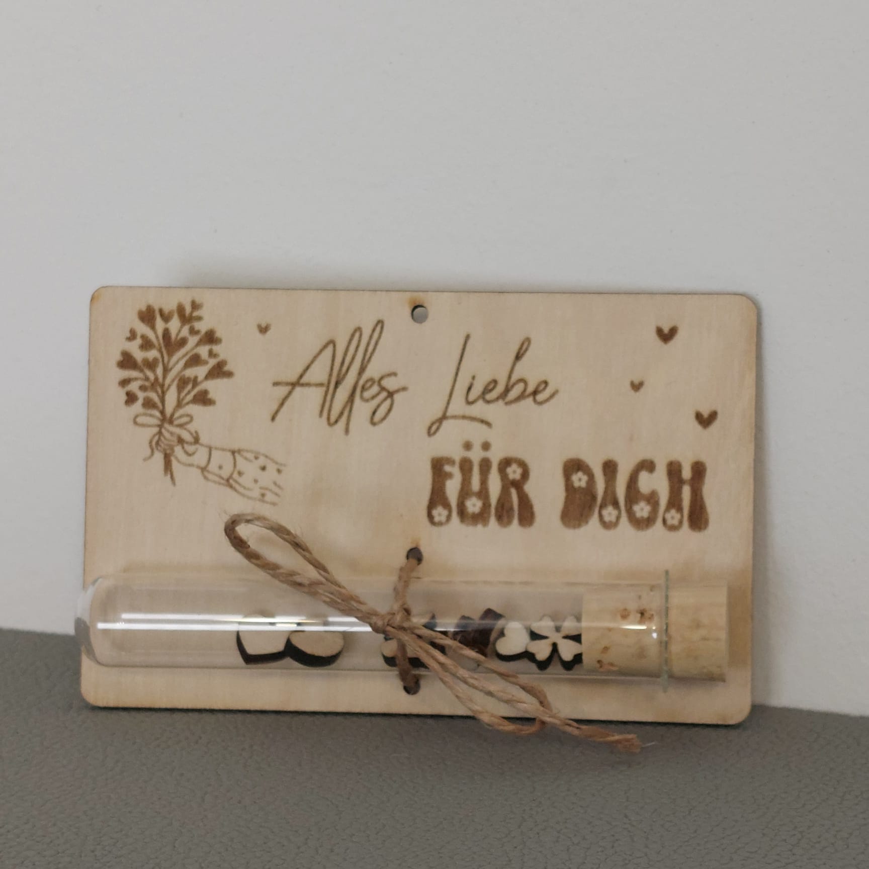 Mit dem Design „Alles Liebe für Dich“ ❤️ , einem Blumenstraß als Motiv und einem sicheren Reagenzglas für Geld oder Gutscheine entsteht ein Geschenk, das den Moment feiert. Unsere Geldgeschenkkarten 🎁 sind liebevolle Begleiter für Geburtstage, oder einfach für Herzensmenschen, die das Leben genießen. Ob als klassisches Geldgeschenk oder als Gutscheinträger: Dieses kleine Holzkunstwerk bleibt in Erinnerung.