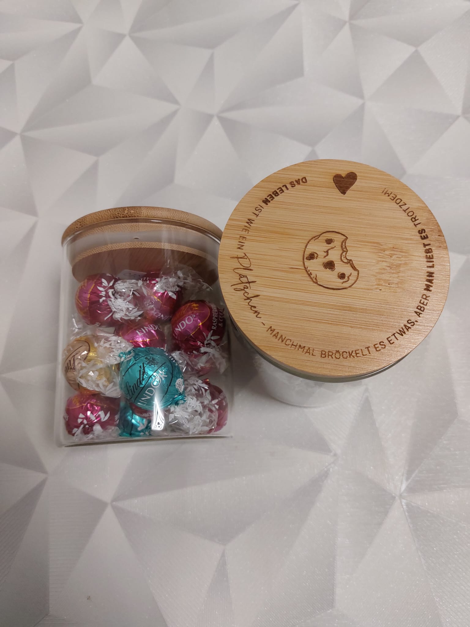 Dieses liebevoll gestaltete Vorratsglas mit Bambusdeckel trägt die Gravur „Das Leben ist wie ein Plätzchen – manchmal bröckelt es etwas, aber man liebt es trotzdem!“ und erinnert uns daran, dass das Leben süß ist – auch mit kleinen Rissen.