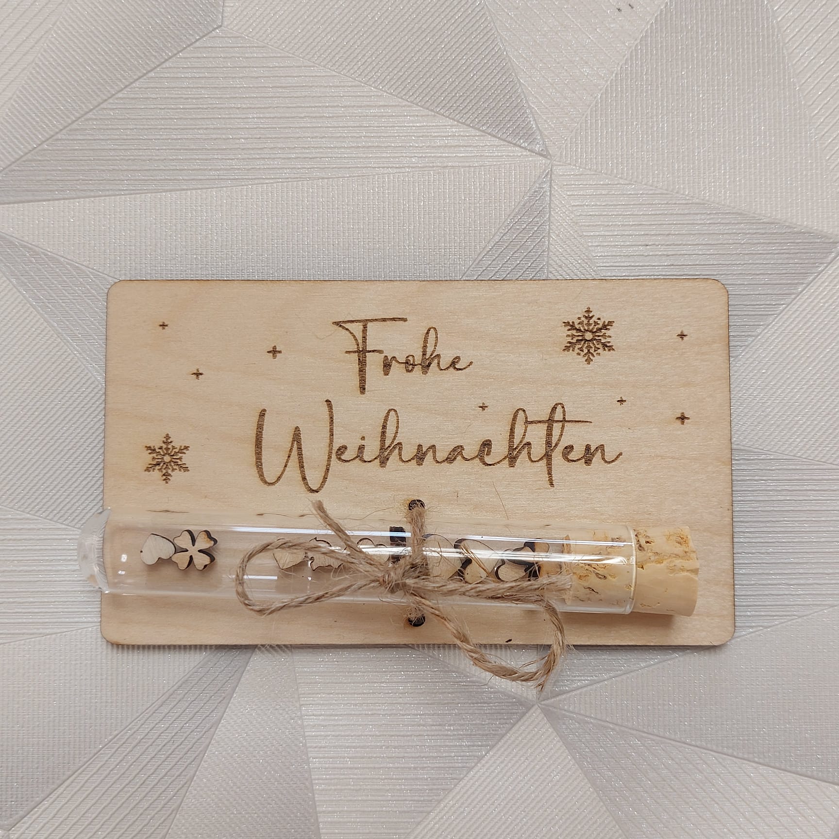 Mit der feinen Gravur „Frohe Weihnachten“, und den funkelnden Sternen ✨ bringt sie die Ruhe und Wärme der Feiertage direkt ins Herz.Das Reagenzglas bietet sicheren Platz für Geldscheine, Gutscheine oder eine persönliche Botschaft – eingerollt wie ein kleines Geheimnis, das beim Öffnen Freude entfaltet.