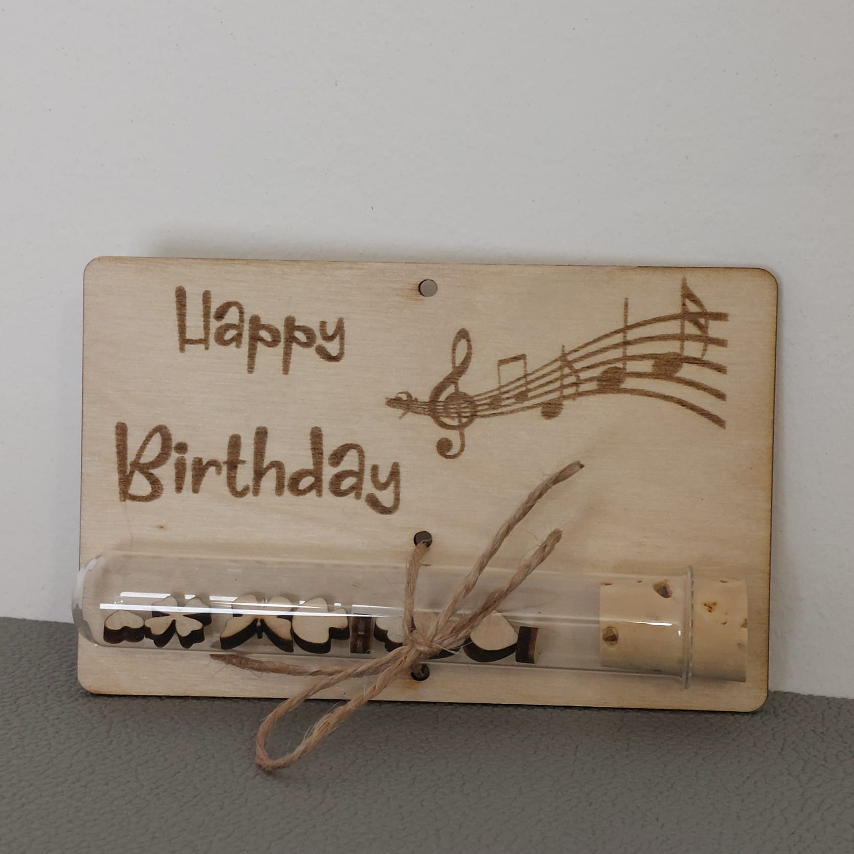 Mit dem verspielten Design „Happy Birthday“ 🎵, zarten Noten und einem sicheren Reagenzglas für Geld oder Gutscheine entsteht ein Geschenk, das den Moment feiert – mit Herz, Stil und einem kleinen Augenzwinkern. Unsere Geburtstagskarten 🎁 sind liebevolle Begleiter für Geburtstage, oder einfach für Herzensmenschen, die das Leben genießen. Ob als klassisches Geldgeschenk oder als Gutscheinträger: Dieses kleine Holzkunstwerk bleibt in Erinnerung.