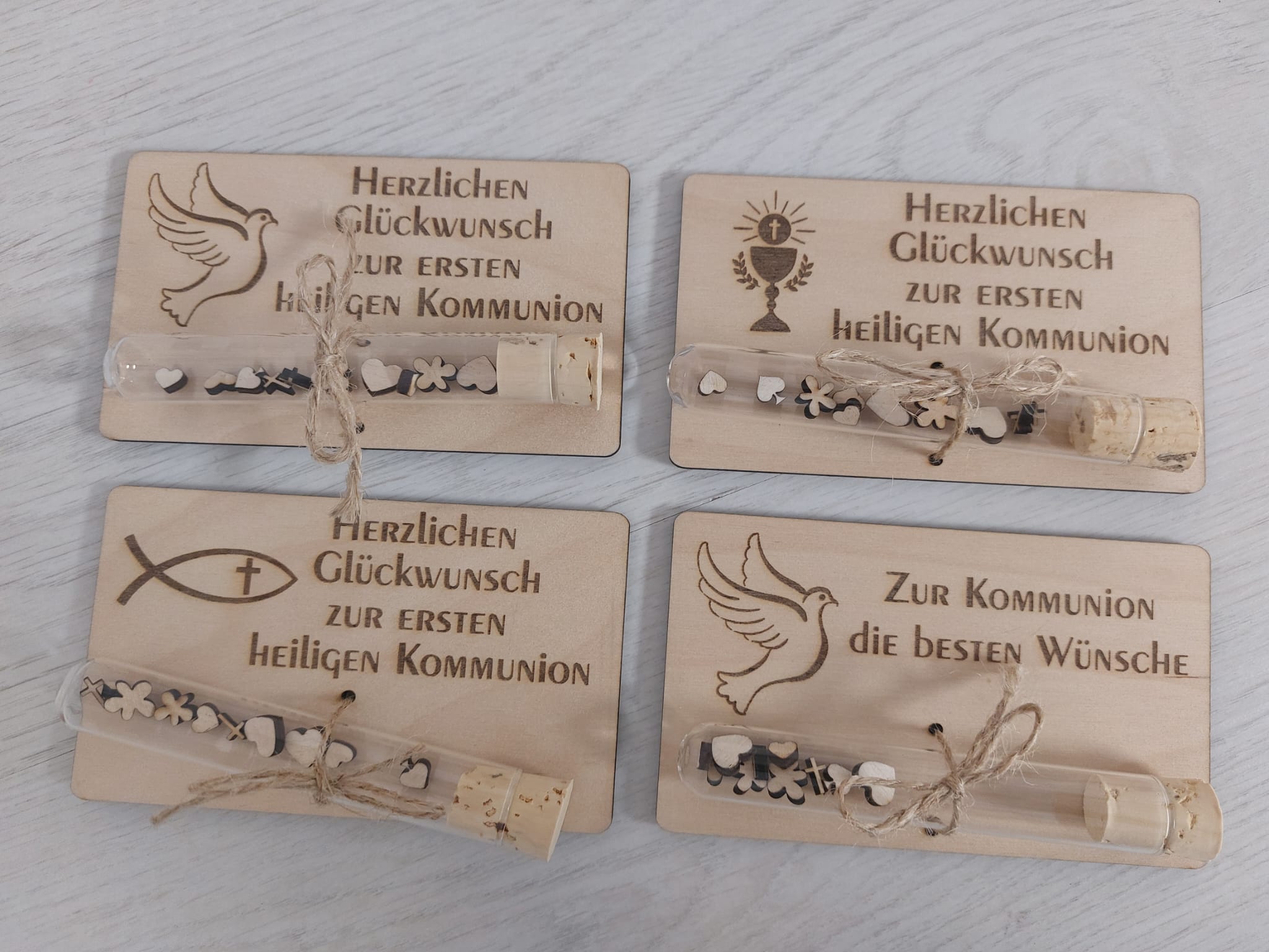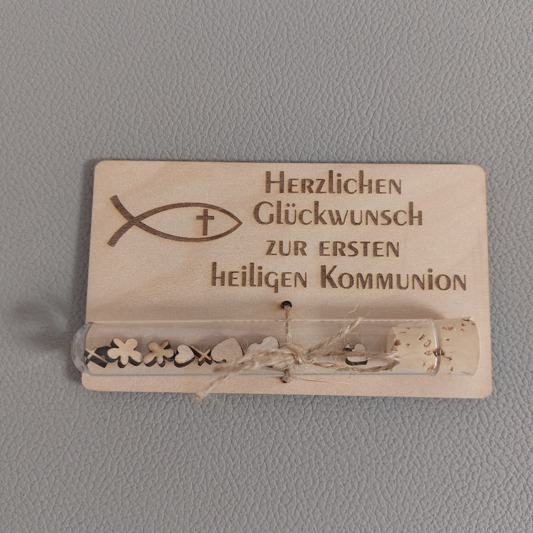 Mit zarter Gravur, dem Design „Herzlichen Glückwunsch zur ersten Heiligen Kommunion“, einem Fisch 🐟 als Glaubenssymbol und einem sicheren Reagenzglas für Geld