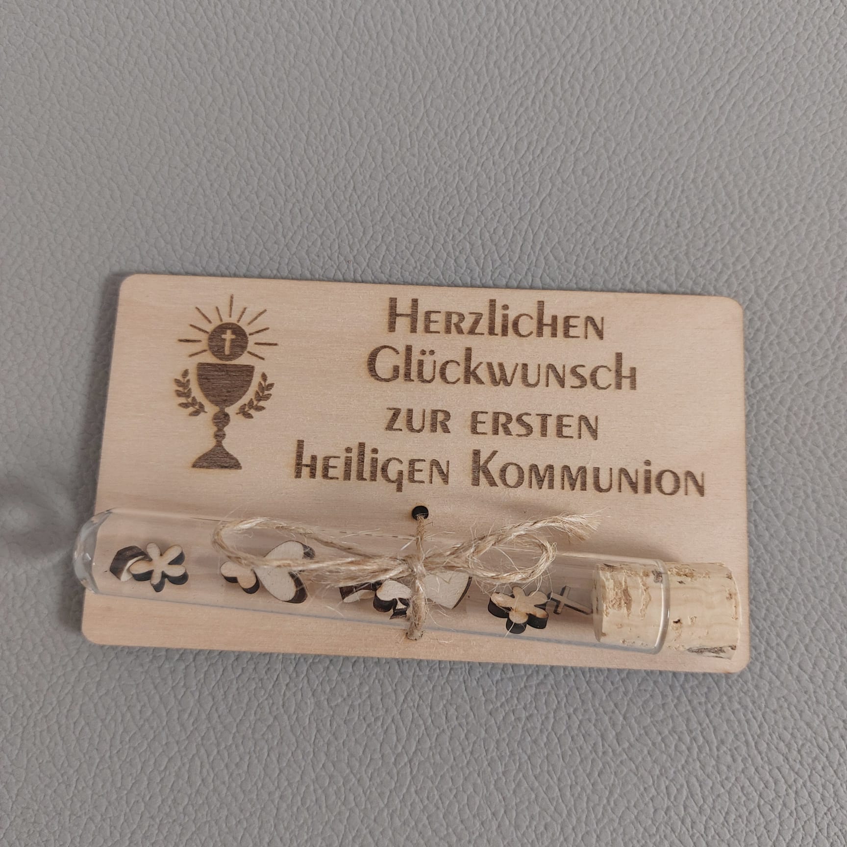 Mit zarter Gravur, dem Design „Herzlichen Glückwunsch zur ersten Heiligen Kommunion“, einem Kelch als Glaubenssymbol und einem sicheren Reagenzglas für Geld