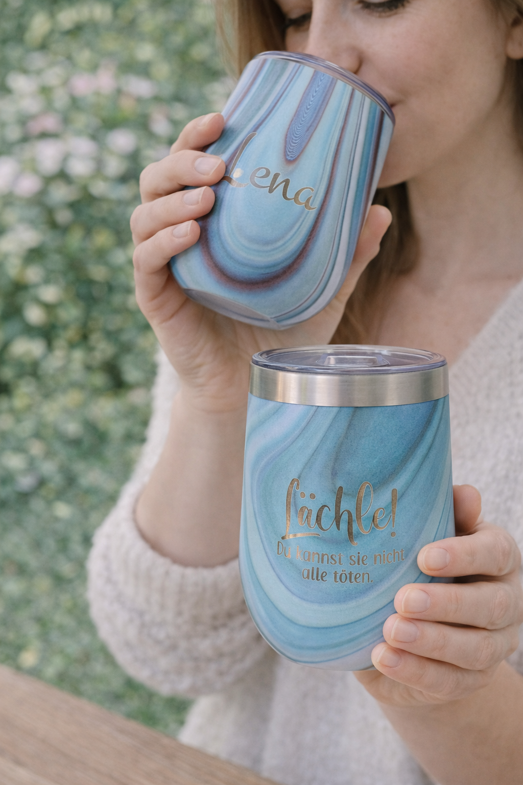 Genuss für unterwegs! Der stilvolle Wein-To-Go-Becher ist nicht nur praktisch, sondern auch ein echter Hingucker. Mit der witzigen Gravur "Lächle! Du kannst sie nicht alle töten." auf der Vorderseite und einer individuellen Namensgravur auf der Rückseite wird er zu deinem ganz persönlichen Lieblingsstück.