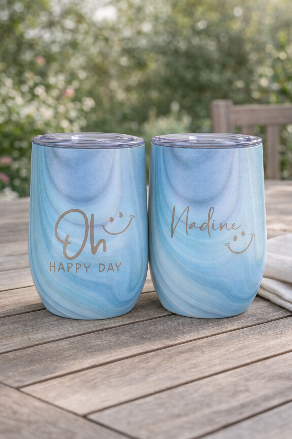 Genuss für unterwegs! Der stilvolle Wein-To-Go-Becher ist nicht nur praktisch, sondern auch ein echter Hingucker. Mit der witzigen Gravur "Oh HAPPY DAY :-)" auf der Vorderseite und einer individuellen Namensgravur auf der Rückseite wird er zu deinem ganz persönlichen Lieblingsstück.