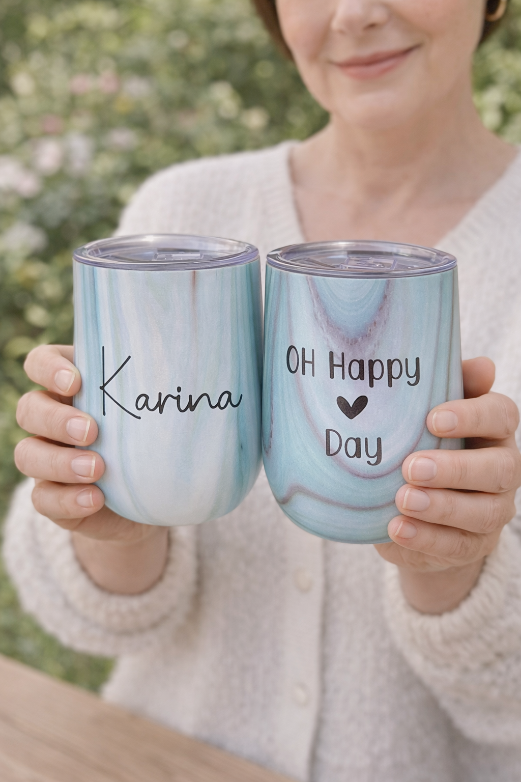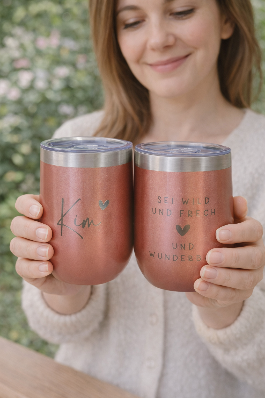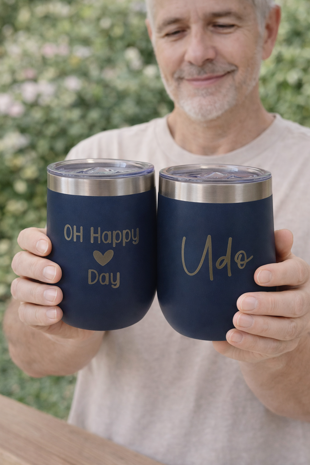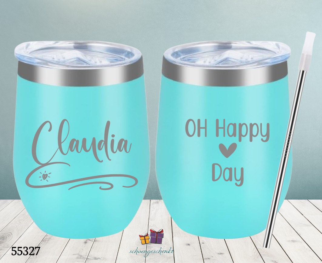 Genuss für unterwegs! Der stilvolle Wein-To-Go-Becher ist nicht nur praktisch, sondern auch ein echter Hingucker. Mit der fröhlichen Gravur „Oh Happy Day“ auf der Vorderseite und einer individuellen Namensgravur auf der Rückseite wird er zu deinem ganz persönlichen Lieblingsstück.