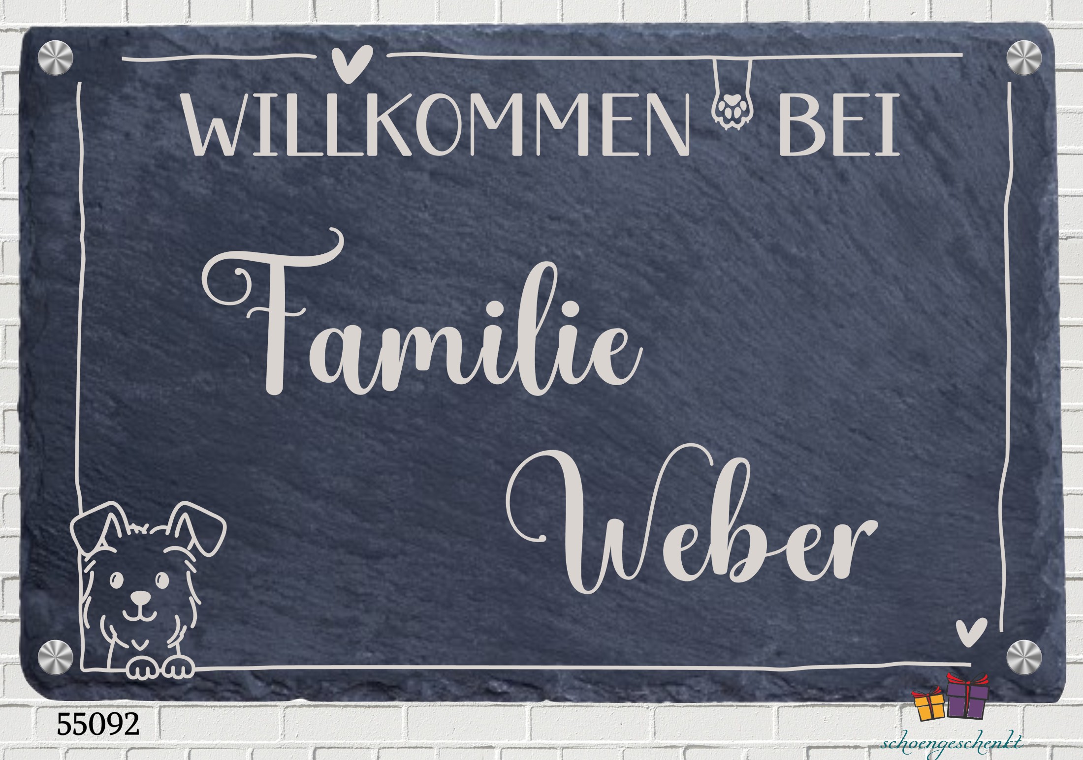 Ein herzlicher Empfang 🐾 mit Pfote, Herz und Persönlichkeit. Diese charmante Schieferplatte begrüßt Gäste mit einem Lächeln – direkt an der Haustür, im Flur oder am Gartenzaun. Der Schriftzug „Willkommen bei Familie Becker“ wird liebevoll ergänzt durch ein Herzsymbol, eine kleine Pfote und einen niedlichen Hund – ideal für tierliebe Haushalte mit Herz. Der Familienname wird individuell für dich graviert – so entsteht ein ganz persönliches Willkommensschild, das Wärme, Humor und Gastfreundschaft ausstrahlt. Ob als Geschenk zur Hauseinweihung oder als persönliche Deko für dein Zuhause: Dieses Schild aus Naturschiefer ist ein echter Blickfang für Zwei- und Vierbeiner.