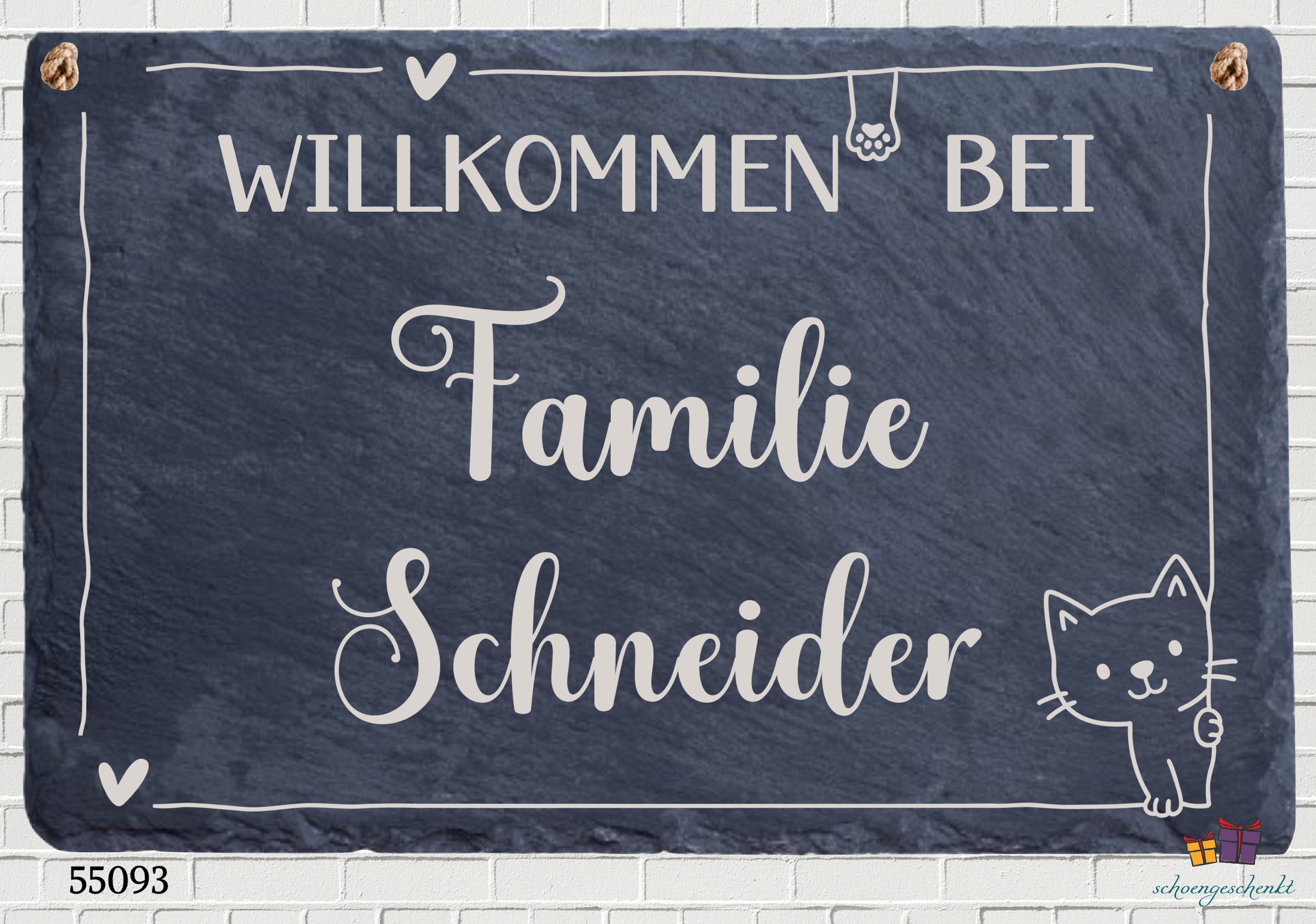 Ein liebevoller Empfang – mit Herz, Pfote und Persönlichkeit. Diese charmante Schieferplatte begrüßt Gäste mit einem Augenzwinkern – direkt an der Haustür, im Flur oder am Gartenzaun. Der Schriftzug „Willkommen bei Familie Limbacher“ wird begleitet von einem Herzsymbol, einer kleinen Pfote und einer niedlichen Katze – perfekt für Familien, die mit Herz und Humor leben. Der Familienname wird individuell für dich graviert – so entsteht ein ganz persönliches Willkommensschild, das Wärme, Tierliebe und Gastfreundschaft ausstrahlt. Ob als Geschenk zur Hauseinweihung oder als persönliche Deko für dein Zuhause: Dieses Schild aus Naturschiefer ist ein echter Blickfang für Zwei- und Vierbeiner.