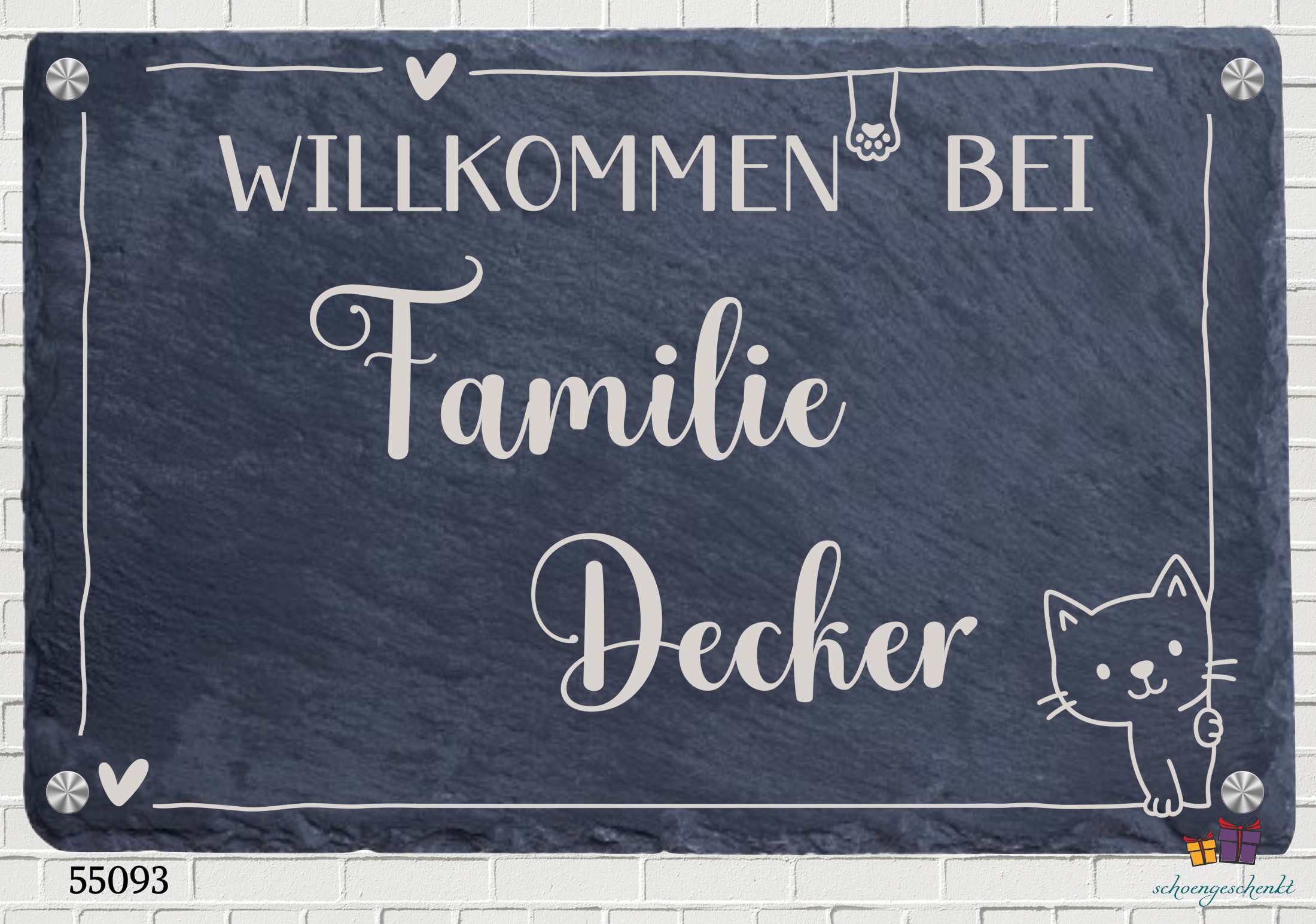 Ein liebevoller Empfang – mit Herz, Pfote und Persönlichkeit. Diese charmante Schieferplatte begrüßt Gäste mit einem Augenzwinkern – direkt an der Haustür, im Flur oder am Gartenzaun. Der Schriftzug „Willkommen bei Familie Limbacher“ wird begleitet von einem Herzsymbol, einer kleinen Pfote und einer niedlichen Katze – perfekt für Familien, die mit Herz und Humor leben. Der Familienname wird individuell für dich graviert – so entsteht ein ganz persönliches Willkommensschild, das Wärme, Tierliebe und Gastfreundschaft ausstrahlt. Ob als Geschenk zur Hauseinweihung oder als persönliche Deko für dein Zuhause: Dieses Schild aus Naturschiefer ist ein echter Blickfang für Zwei- und Vierbeiner.