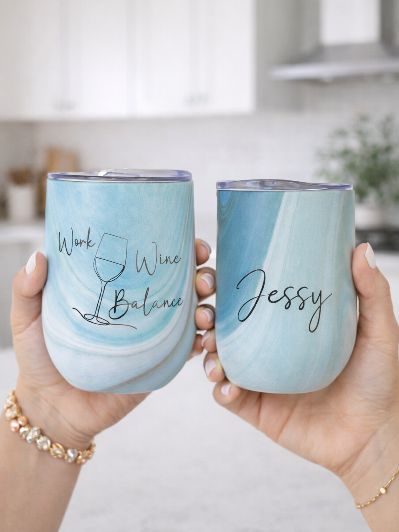 Genuss für unterwegs! Der stilvolle Wein-To-Go-Becher ist nicht nur praktisch, sondern auch ein echter Hingucker. Mit der witzigen Gravur "Work, Wine, Balance" auf der Vorderseite und einer individuellen Namensgravur auf der Rückseite wird er zu deinem ganz persönlichen Lieblingsstück.