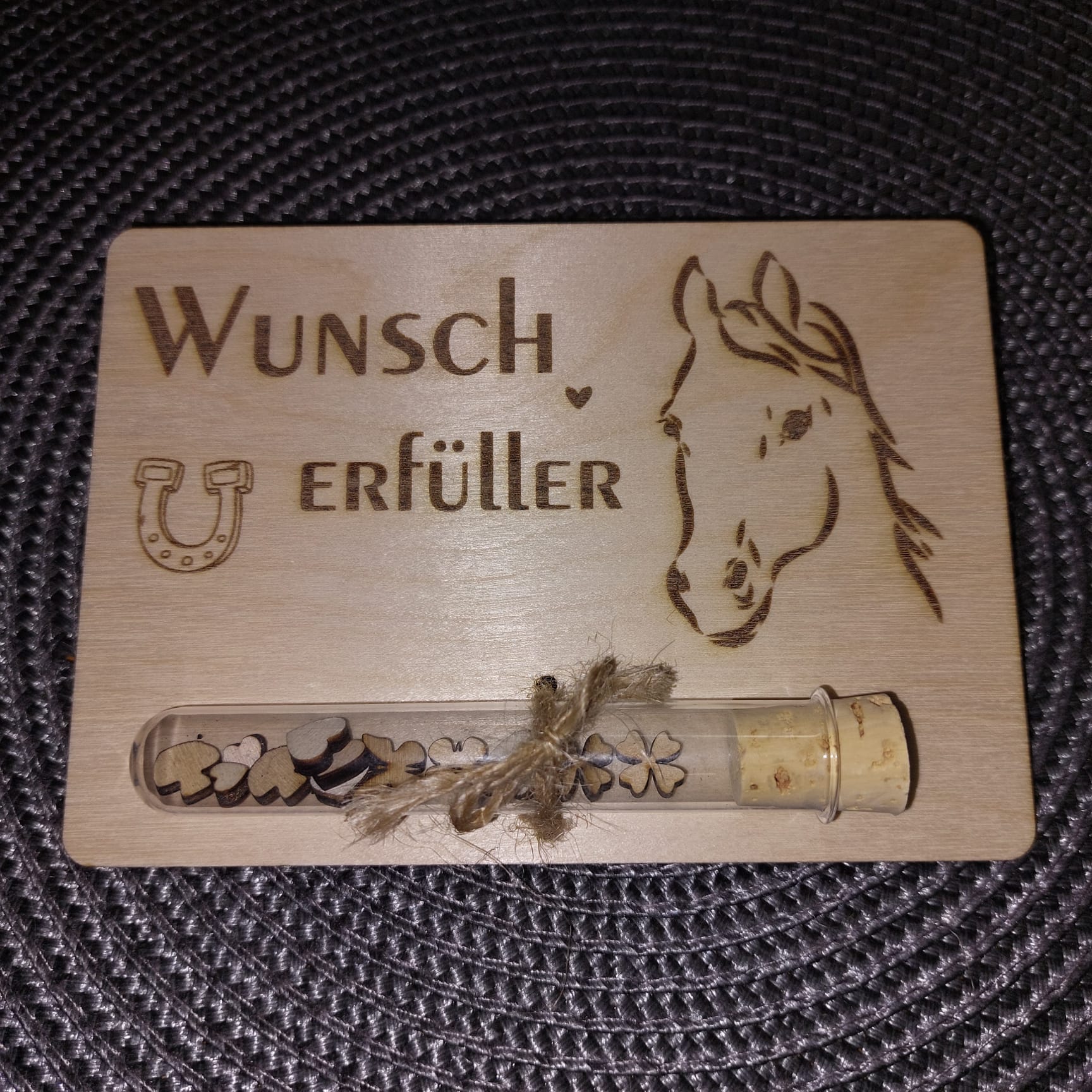 Mit dem Design „Wunscherfüller“, 🐎 tollem Pferde Motiv und einem sicheren Reagenzglas für Geld oder Gutscheine entsteht ein Geschenk, das den Moment feiert – mit Herz, Stil und einem kleinen Augenzwinkern. Unsere Geldgeschenkkarten 🎁 sind liebevolle Begleiter für Geburtstage, oder einfach für Herzensmenschen um Danke zu sagen. Ob als klassisches Geldgeschenk oder als Gutscheinträger: Dieses kleine Holzkunstwerk bleibt in Erinnerung.