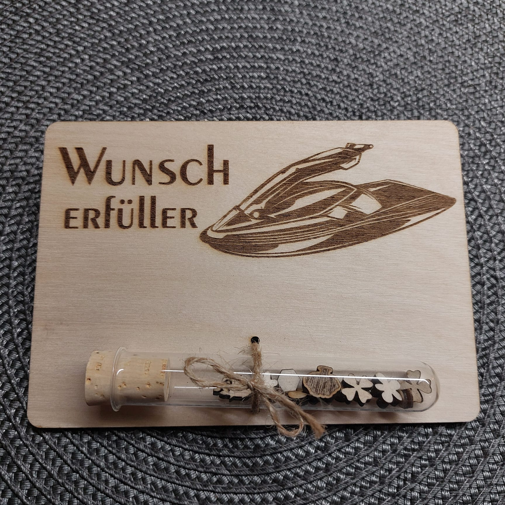 Mit dem Design „Wunscherfüller“, 🚤 einem Jetski Motiv und einem sicheren Reagenzglas für Geld oder Gutscheine entsteht ein Geschenk, das den Moment feiert – mit Herz, Stil und einem kleinen Augenzwinkern. Unsere Geldgeschenkkarten 🎁 sind liebevolle Begleiter für Geburtstage, oder einfach für Herzensmenschen um Danke zu sagen. Ob als klassisches Geldgeschenk oder als Gutscheinträger: Dieses kleine Holzkunstwerk bleibt in Erinnerung.