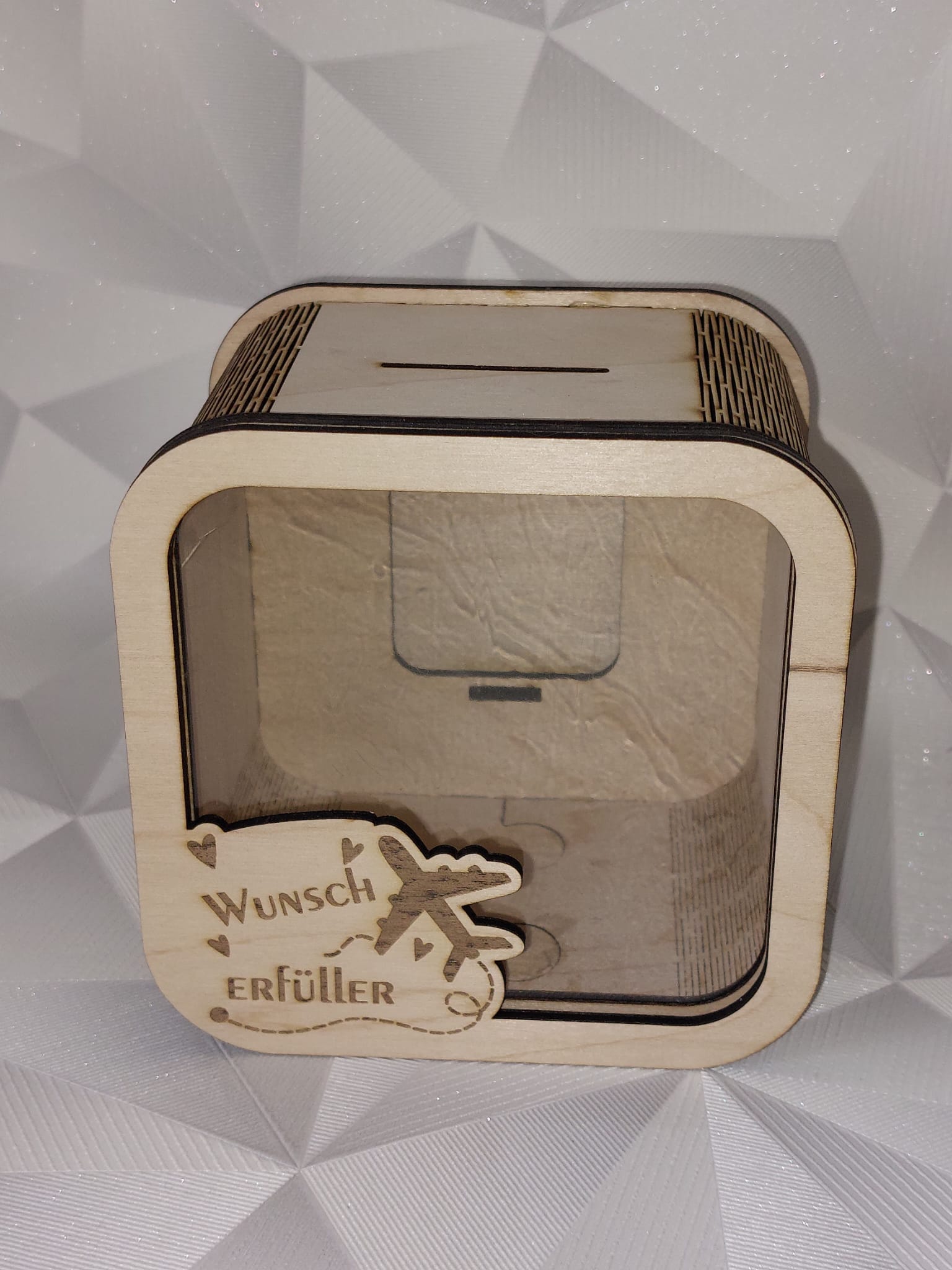 Diese liebevoll gestaltete Holz-Spardose ist ein Symbol für Fernweh, Freiheit