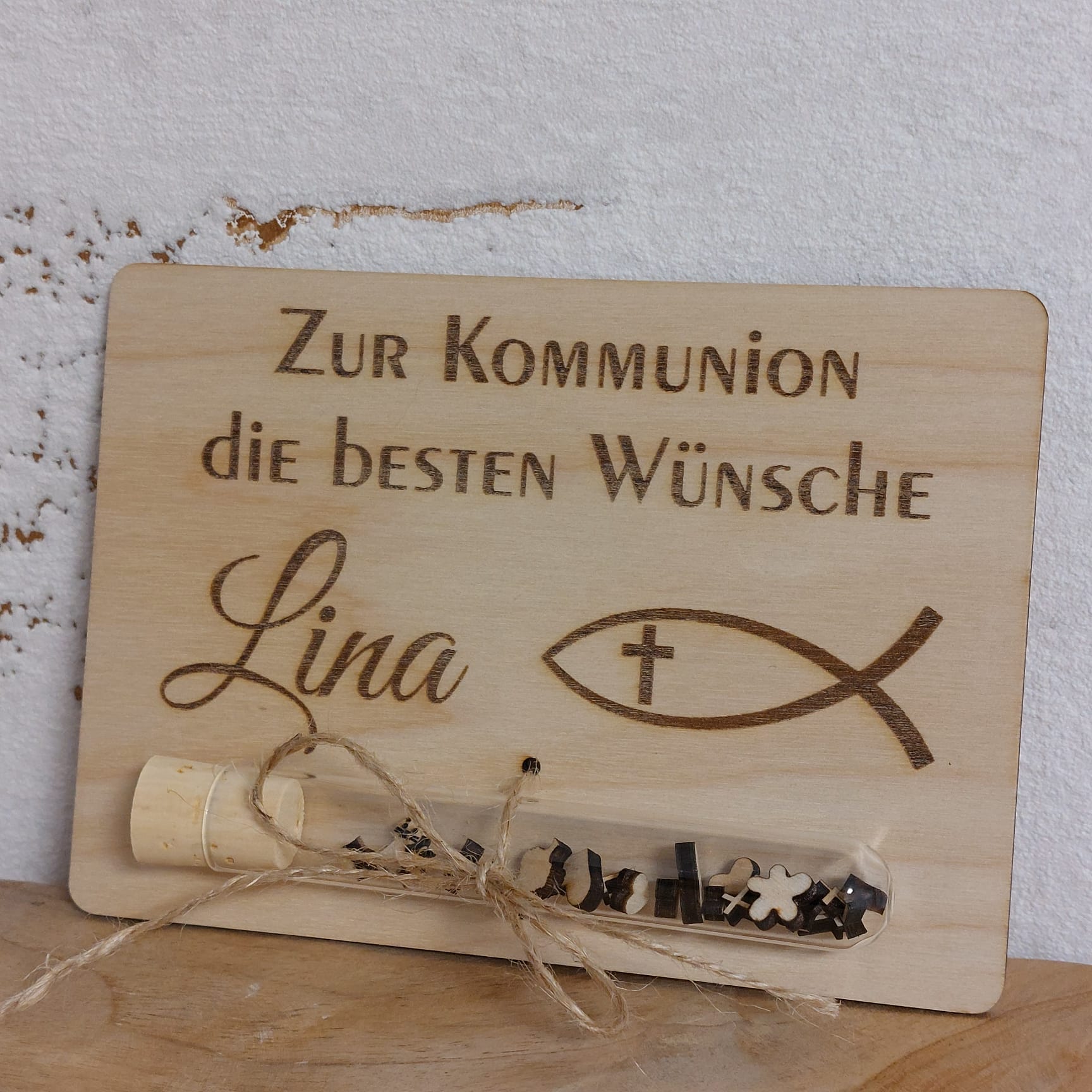 Diese große Geldgeschenkkarte aus Holz ist mehr als nur eine Verpackung – sie ist ein liebevoller Botschafter der Freude. Das fein gravierte Design mit dem "Namen des Kommunionkindes und wenn man möchte auch das Datum", ergänzt durch einen 🐟 Fisch als Symbol des Glaubens, macht diese Karte zu einem bleibenden Erinnerungsstück voller Herzenswärme.